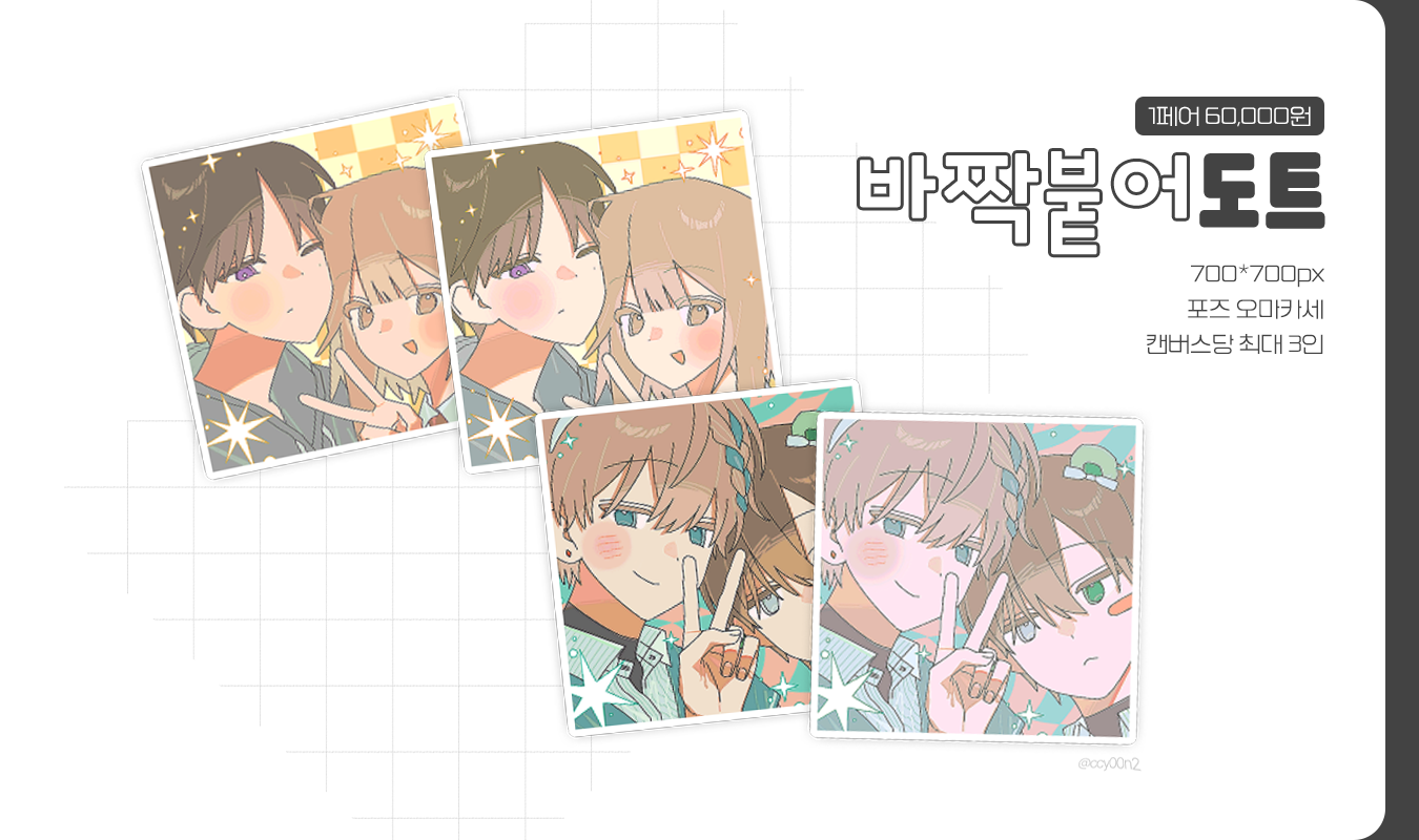 ✽ 색감 차이로 캐릭터의 색이 변형될 수 있습니다. 이에 민감하신 분은 신청을 재고 바랍니다.